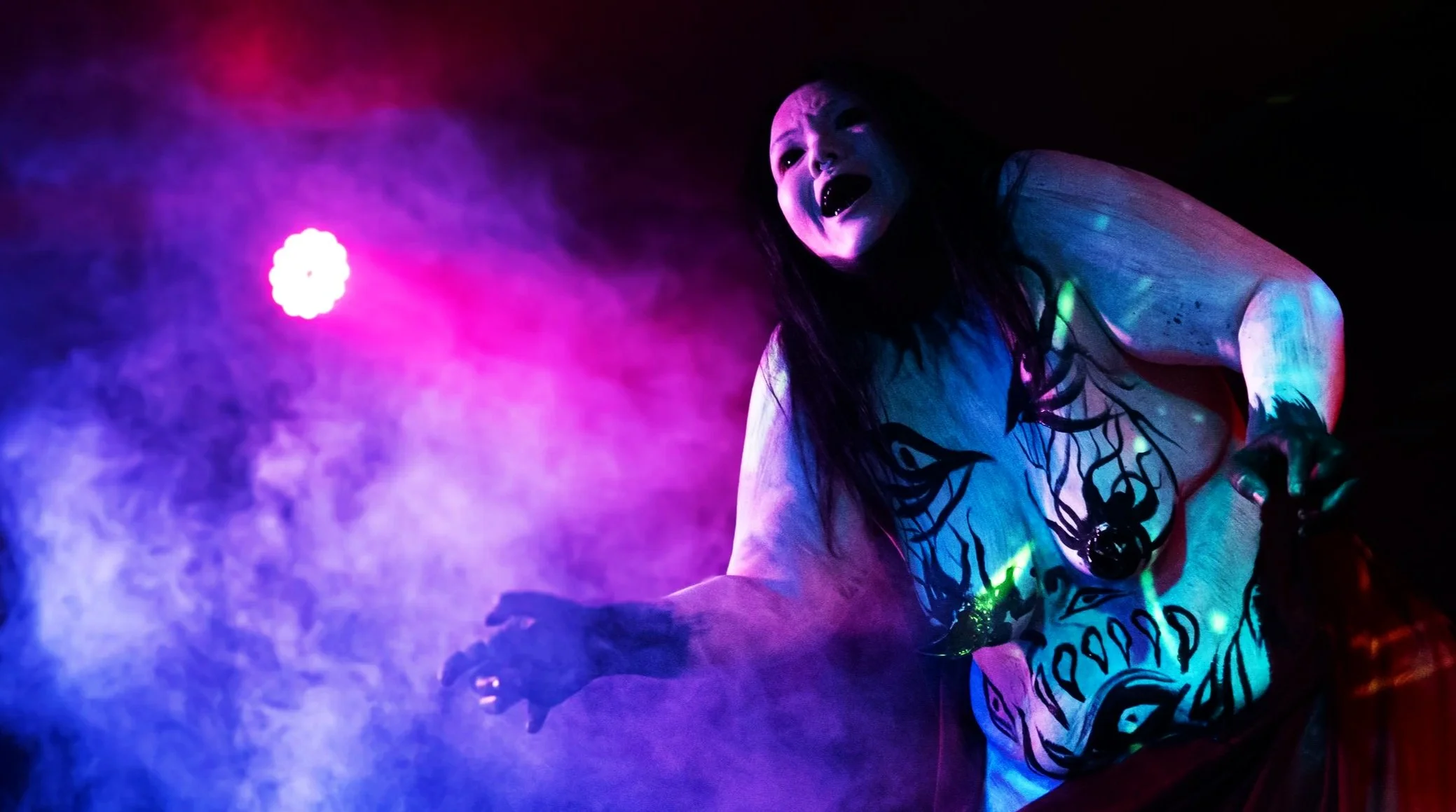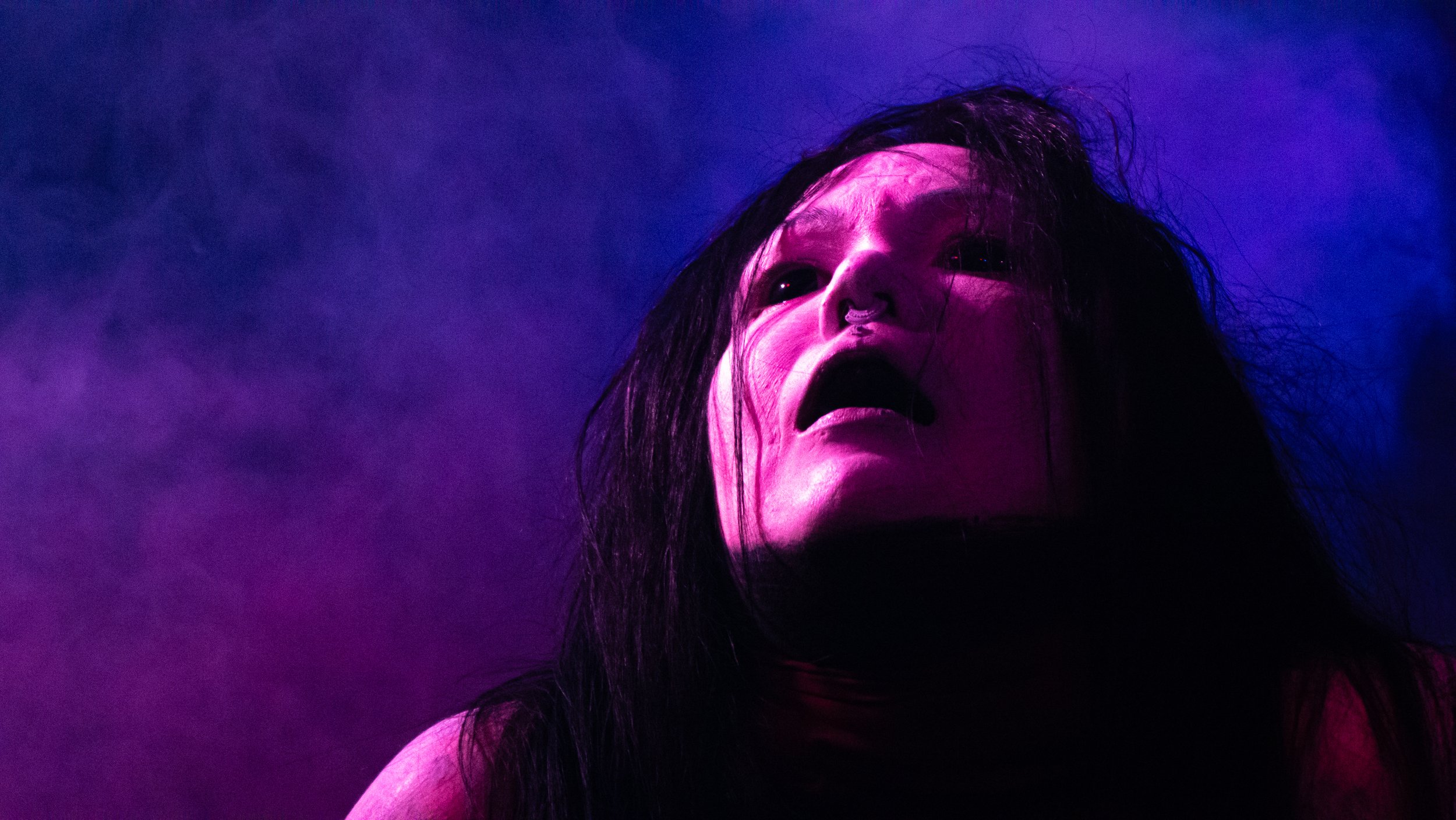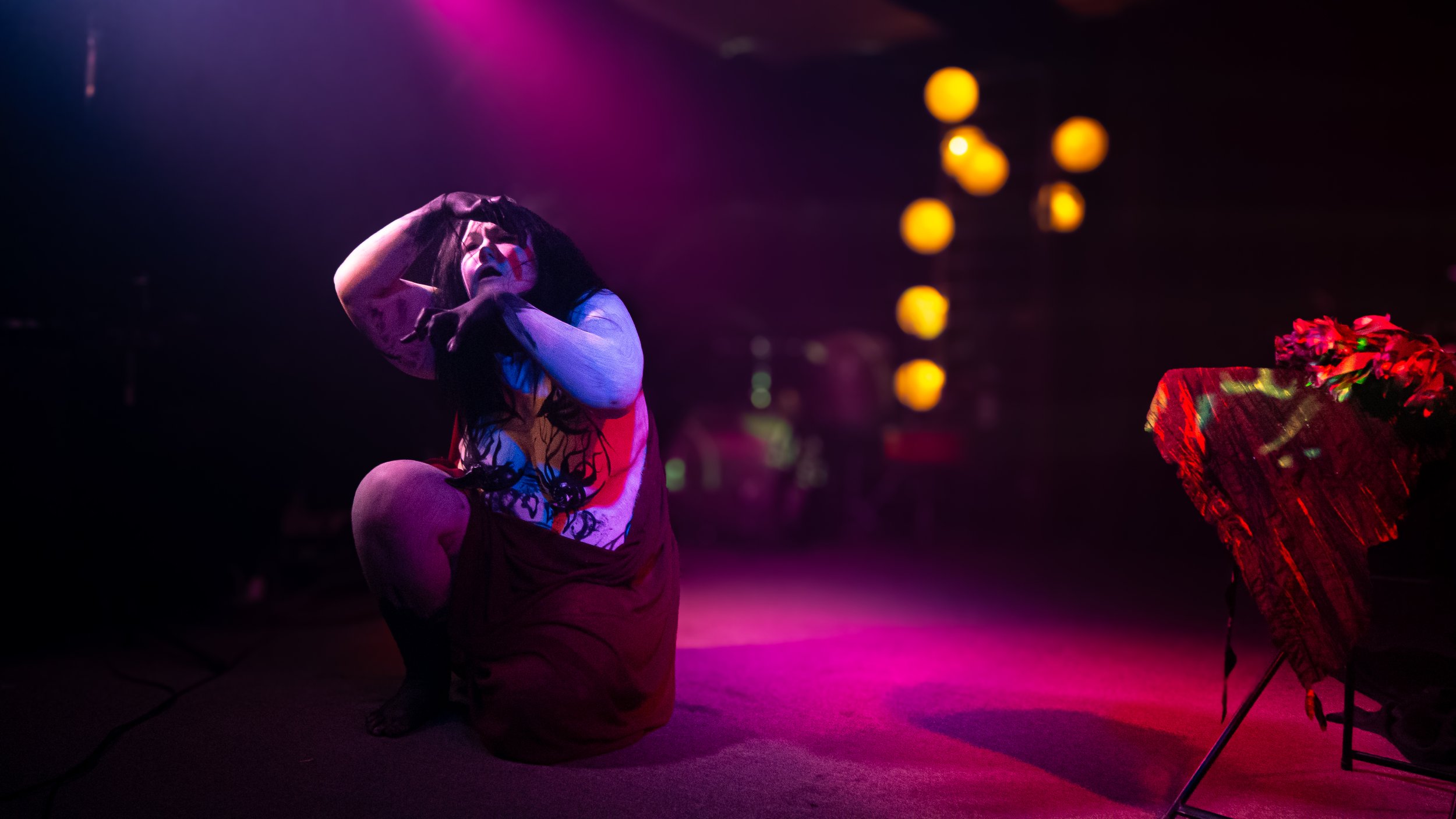 When we started talking about the concept, I asked Lauren what her own vision was, and her response was that she wanted to become one of my artworks, that the goal was to be an empty vessel, able to allow my intention as an artist to come into her and to let that come alive and explore it within her own body. I designed Laurens draped costume to frame the front of the torso where I would be painting the most, and backstage we applied her usual Butoh paint, black hands and feet and white on the body to represent ashes, but in this context also a blank canvas. Black sclera lenses and tooth paint were applied and thanks to Halloween being right around the corner, we were able to snag up some latex devil horns and attach those to the chest, to preinstall my motif of the horns nipples that appears in most of my figurative work.